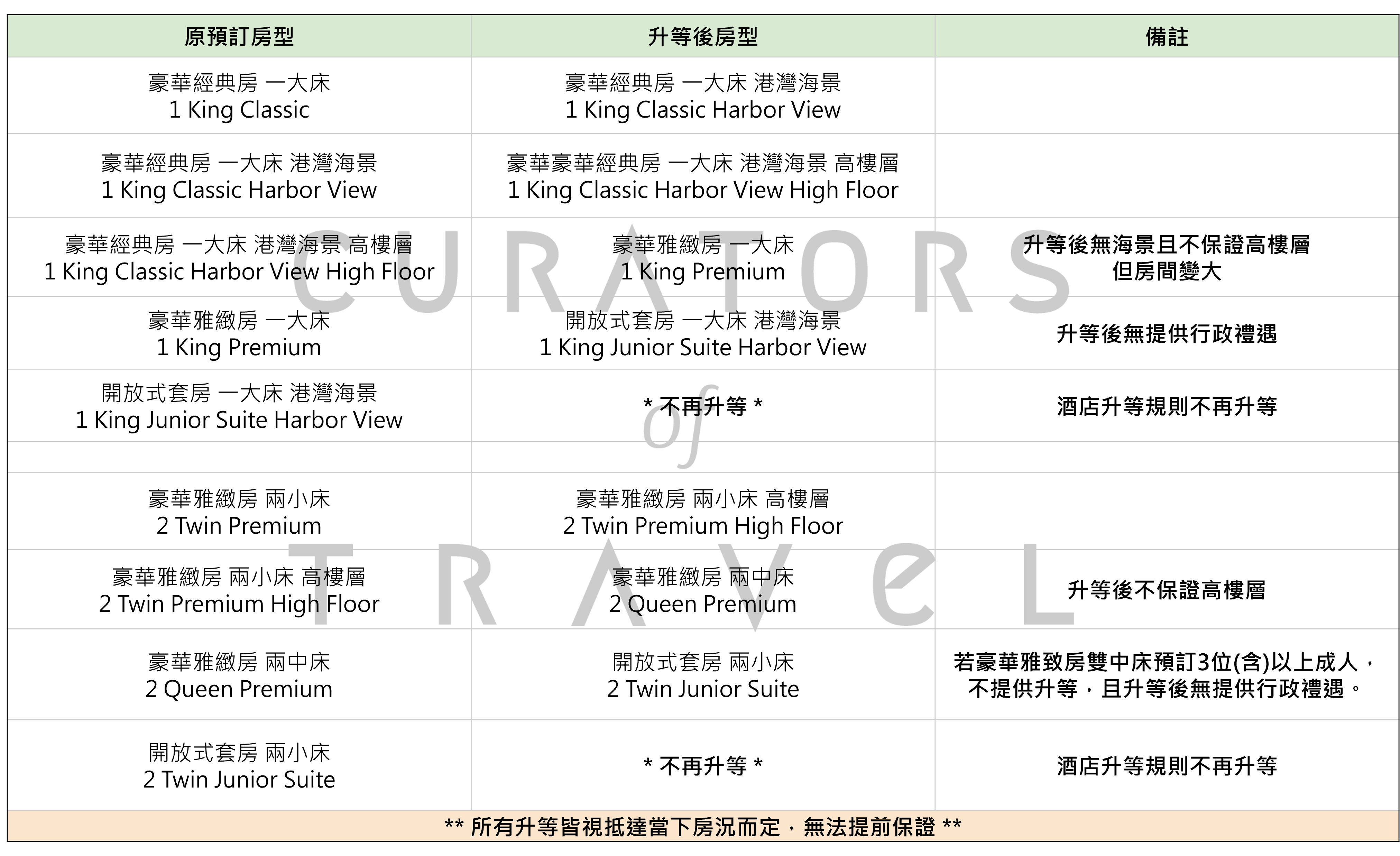 - 部分房型預訂後不再提供升等,請參考最下方表格說明。